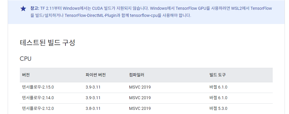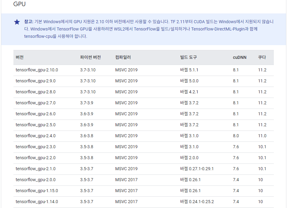 우선 tensorflow에 맞는 Python과 CUDA 를 확인하려면 아래의 사이트에서 확인해야 합니다.